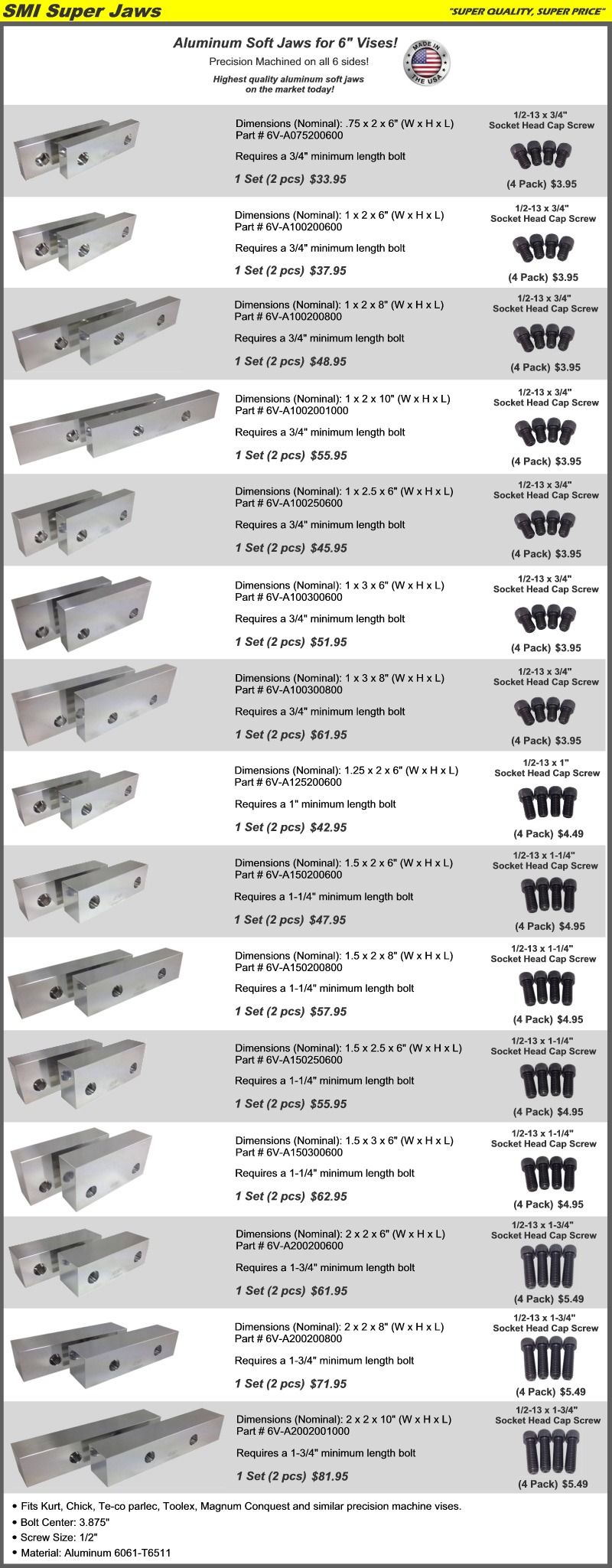 SMI Aluminum Soft Jaws, Highest quality aluminum vise jaws on the market today! Fully machined on all 6 sides, Vice Jaws Bolts, Soft Jaw Bolts